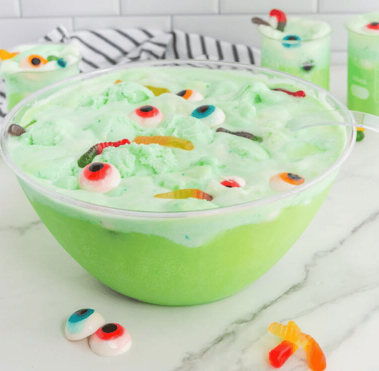 This Halloween sherbet punch is a fizzy, fruity drink made with lemon-lime soda, pineapple juice, and scoops of green sherbet for a spooky twist. It’s frothy, colorful, and packed with floating worms and eyeballs, the ultimate party potion for ghosts, ghouls, and goblins alike!