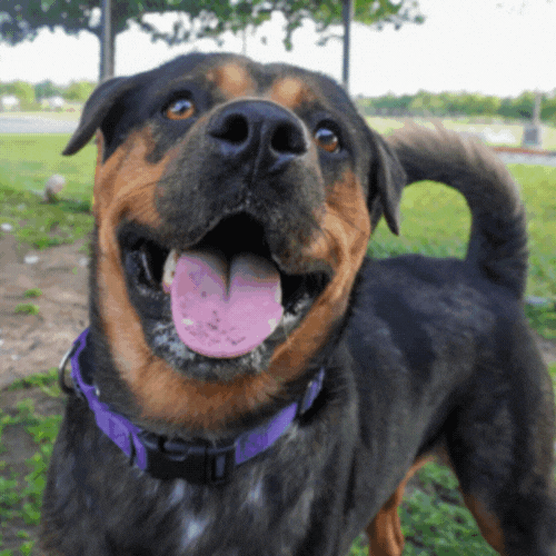 Meet Amora, a 3-year-old large mixed breed with a stunning black and brown coat and a heart as warm as summer sun. This playful girl loves patrolling the yard for squirrels, splashing in her kiddie pool, and carrying her favorite stuffie wherever she goes.