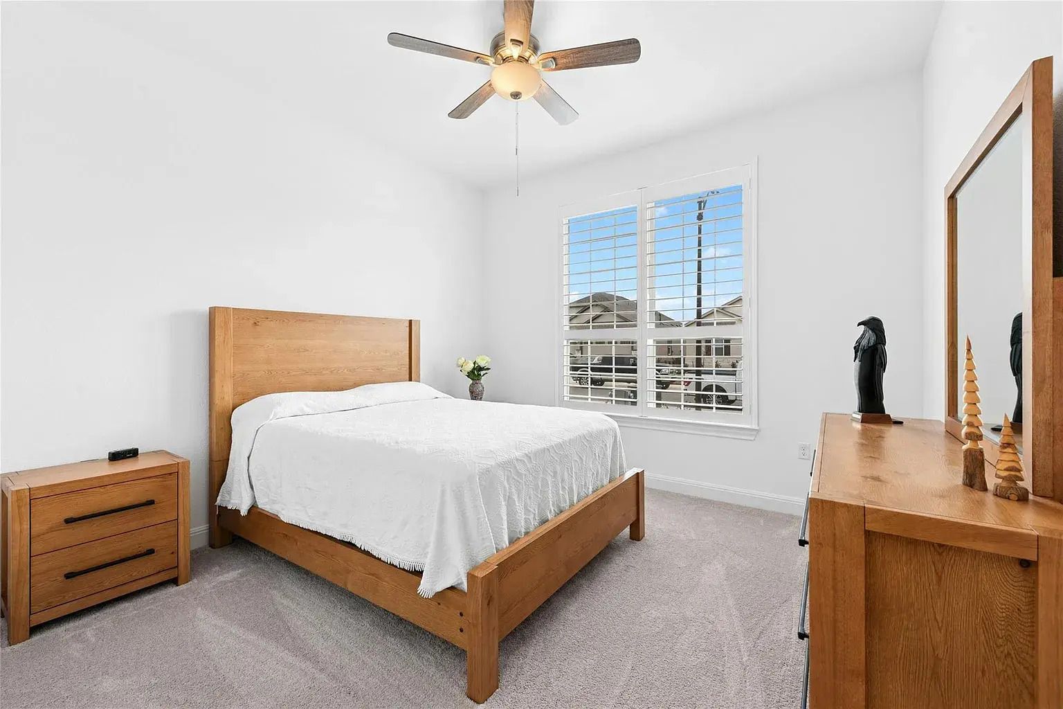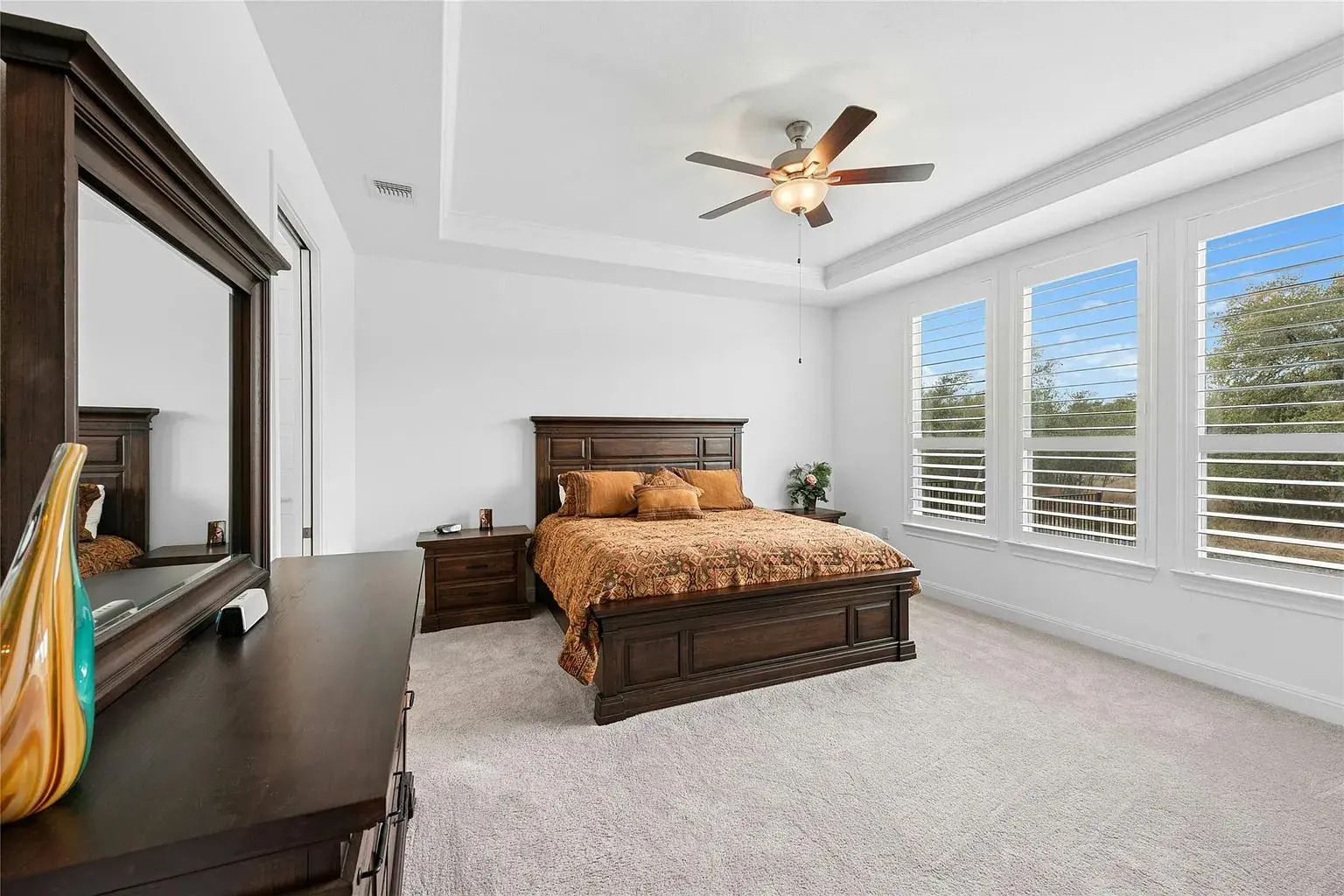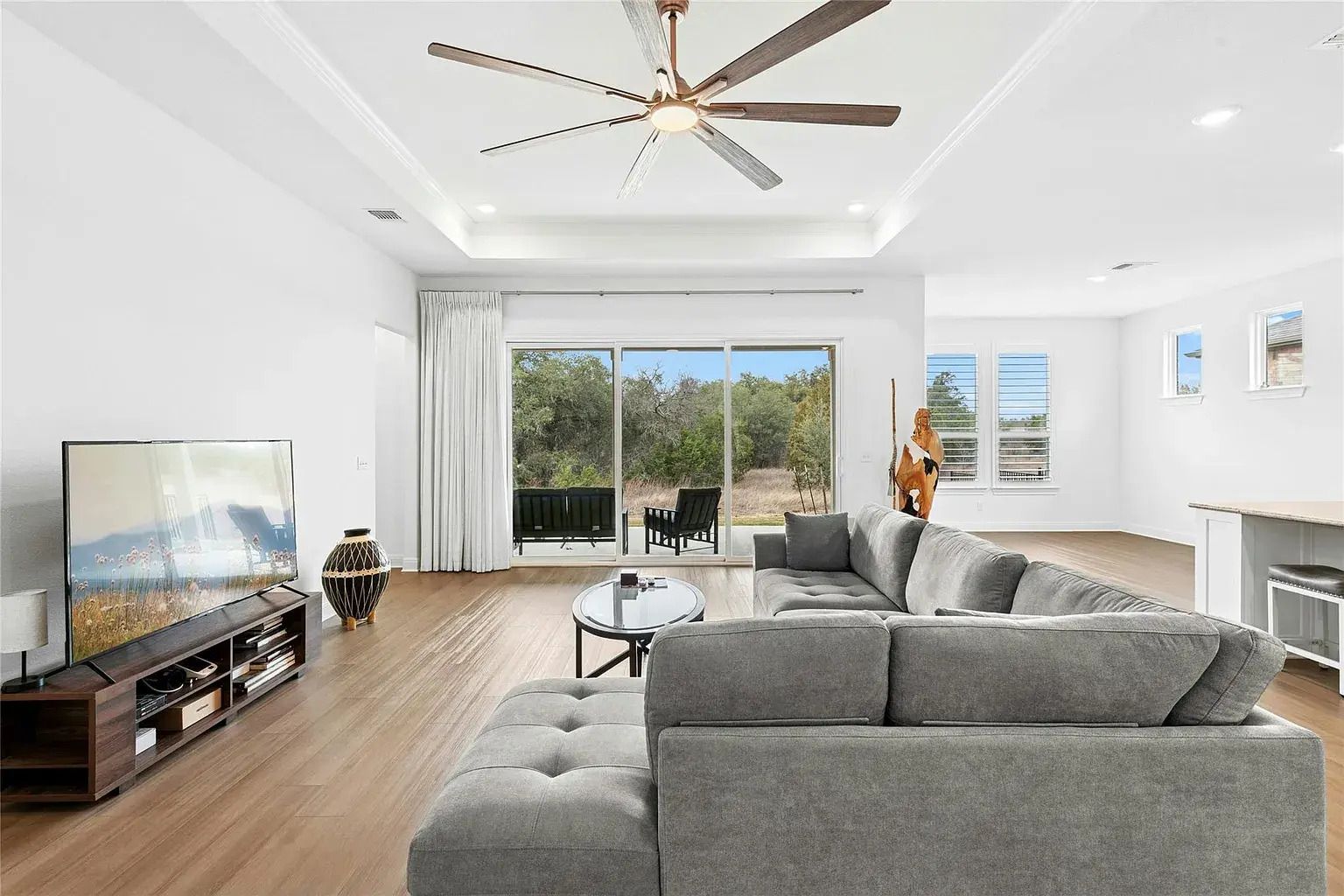 Inside, 2,352 square feet showcases wood-look luxury vinyl plank flooring, plantation shutters, and tray ceilings that elevate the family room and primary bedroom. The kitchen features white cabinetry, granite countertops, a center island with breakfast bar seating, pull-out cabinet trays, a walk-in pantry, and Whirlpool built-in appliances paired with a five-burner gas cooktop. The private guest suite includes its own full bath with quartz counters, while the primary suite offers an oversized walk-in closet and a striking walk-in glamour shower.