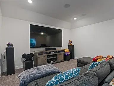 Upstairs, a game room and media room with in-ceiling Klipsch speakers add entertainment value, while the richly painted office offers a peaceful spot for work or study. Durable luxury vinyl plank flooring enhances the home’s warm, modern feel.