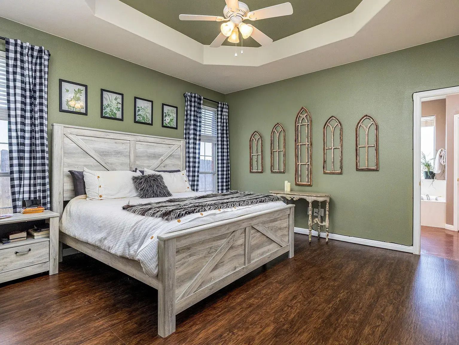 The 3,255 square foot layout is designed for comfort and flexibility, featuring five spacious bedrooms and two primary suites positioned on opposite ends of the home for privacy. Easy-to-maintain stained concrete, tile, and wood laminate flooring run throughout, with no carpet.