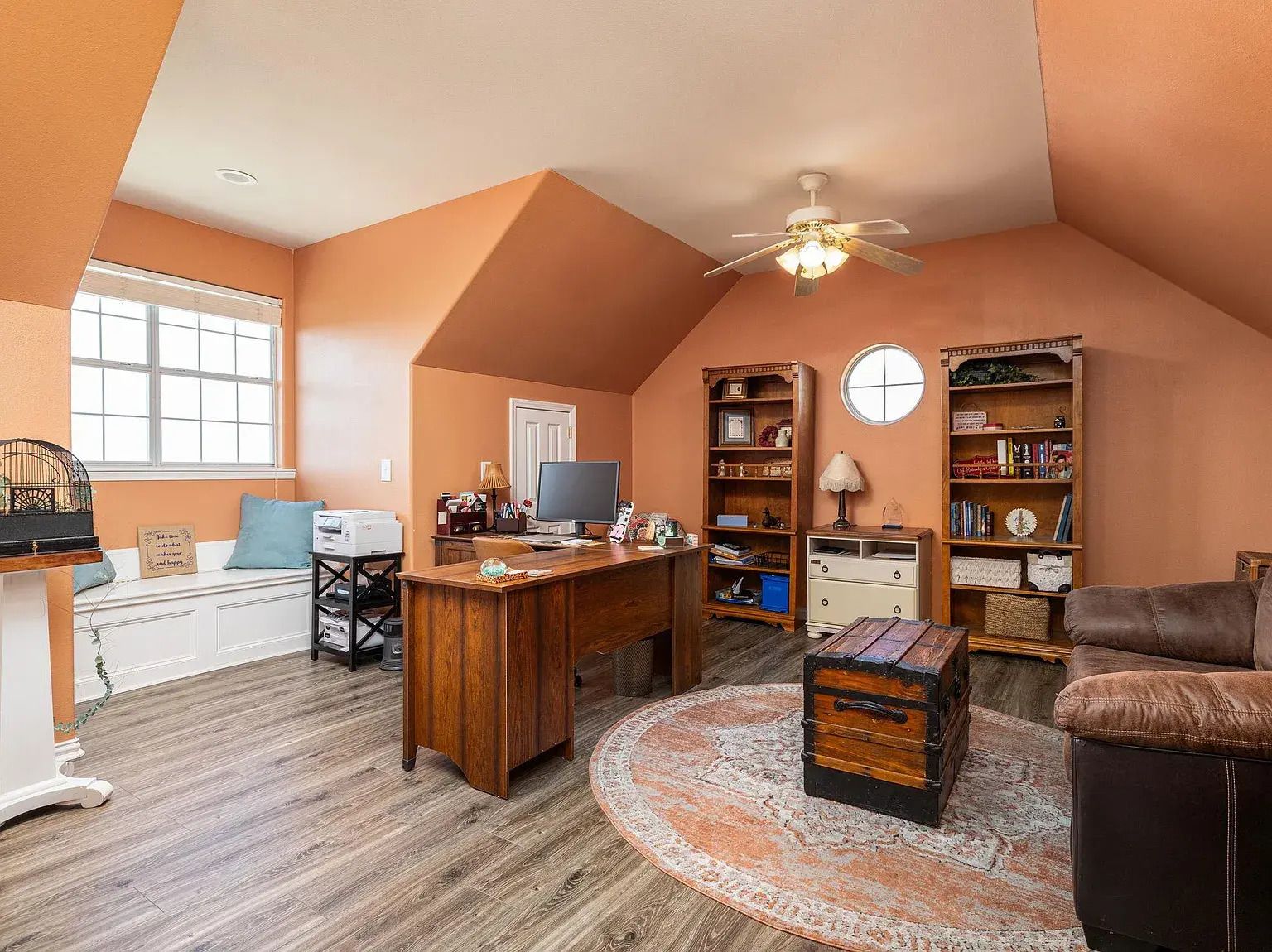 Upstairs, a private bonus room serves well as a game room or office and includes access to a large walk-in, climate-controlled storage space ideal for hobbies or seasonal use. Multiple living and dining areas allow the home to adapt easily to gatherings or quiet routines. The attached two-car garage and additional parking support both residents and guests with ease.