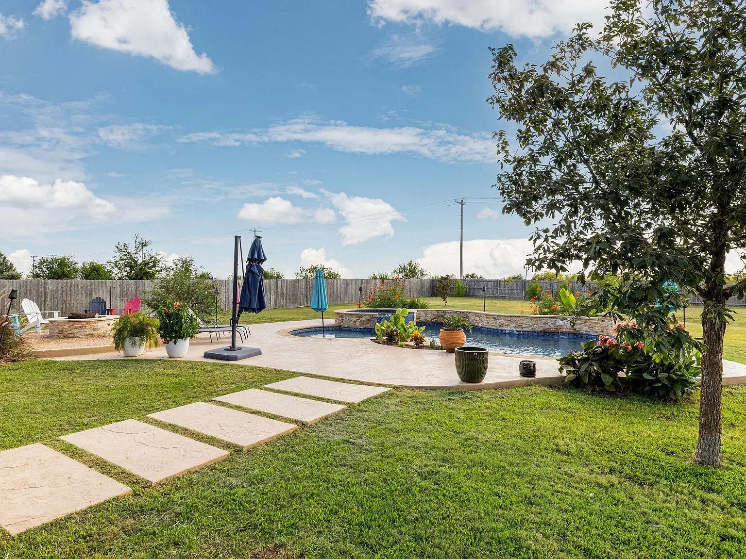 Outdoor living takes center stage with a custom heated pool and spa built in 2023, complete with cascading waterfalls. A large covered patio with ceiling fans overlooks the fully fenced backyard, while an automatic sprinkler system maintains the entire acre. Evenings are best spent around the custom stone firepit, enjoying wide-open views and Texas sunsets.