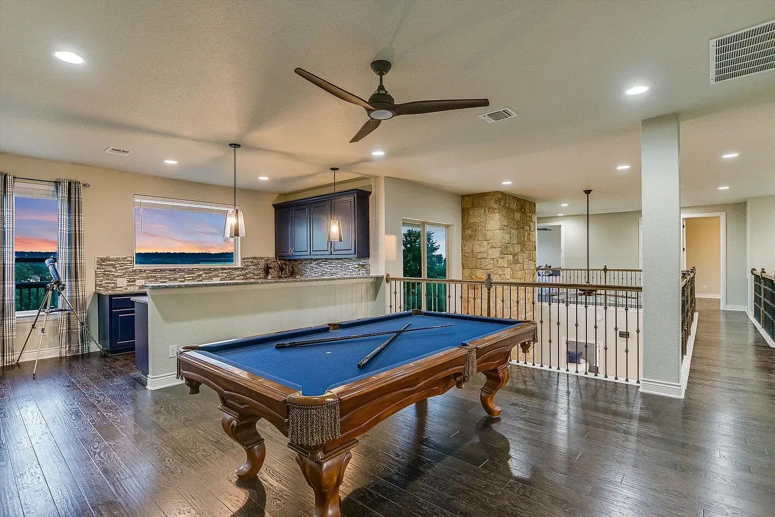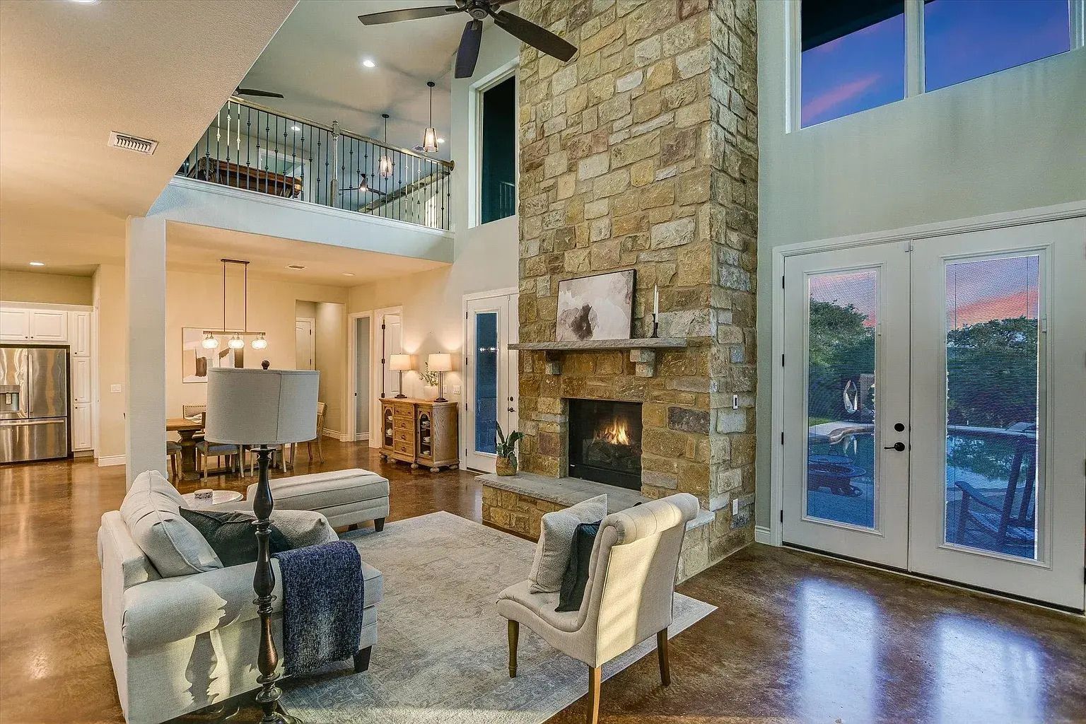 Inside, 3,851 square feet unfolds with custom craftsmanship and thoughtful detail. Rich custom wood flooring runs throughout the main living spaces, complemented by beamed and high ceilings that add warmth and scale. The open floor plan connects two spacious living areas, anchored by a striking custom two-story fireplace that creates a dramatic focal point.