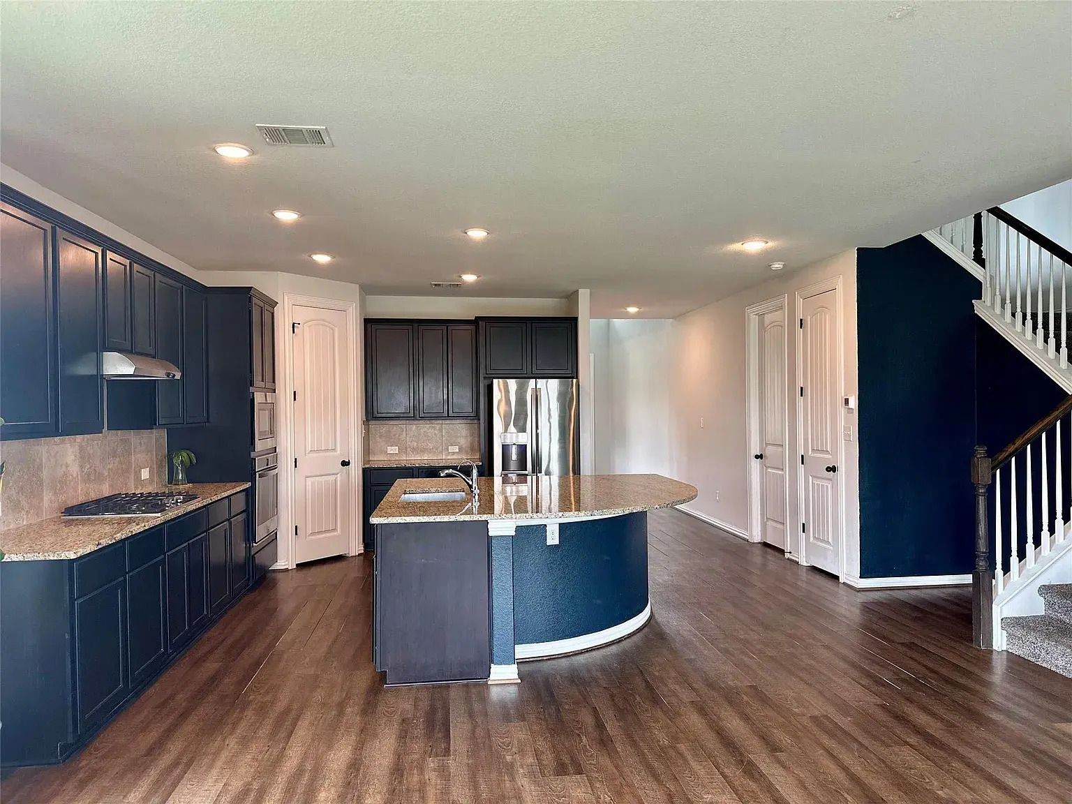Inside, 3,499 square feet unfolds across two levels. The primary bedroom is located on the main level and stands out for its size and privacy. The en-suite bath features a soaking tub, walk-in shower, and a generously sized walk-in closet that provides ample storage. The kitchen offers granite countertops, abundant cabinetry, and breakfast bar seating, creating a functional hub for meals and gatherings. Flooring throughout the home includes vinyl and wood, keeping the interior durable and easy to maintain.