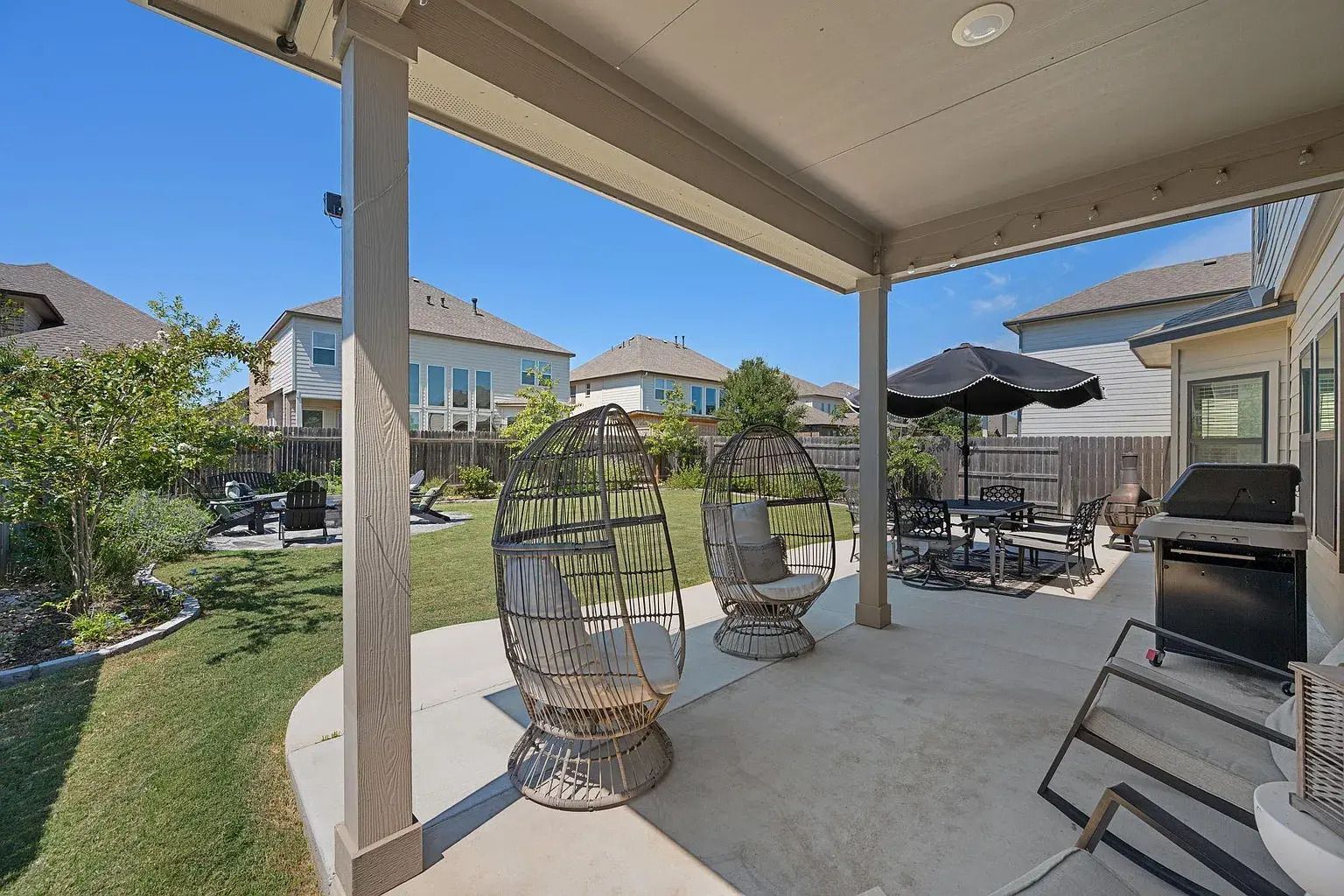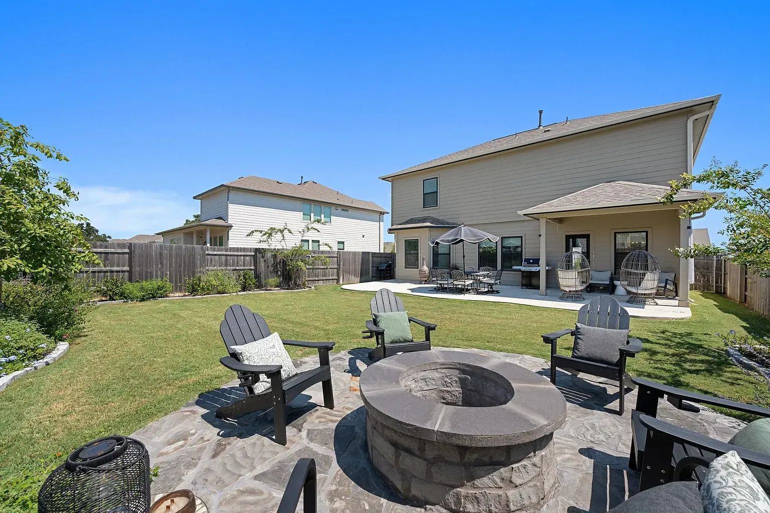 The backyard was designed for relaxing and entertaining. A large extended patio, flagstone firepit area and added landscaping create a private and welcoming outdoor space. Whether you enjoy quiet evenings outside or hosting friends, this yard is ready for both. Morningstar residents enjoy community pools, trails, parks, a dog park and planned neighborhood events, plus access to the well regarded Liberty Hill ISD.