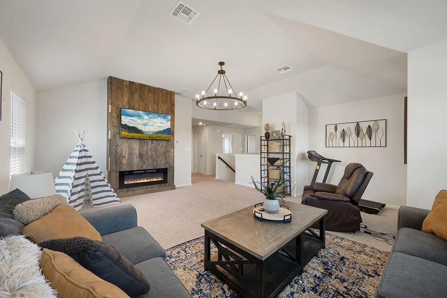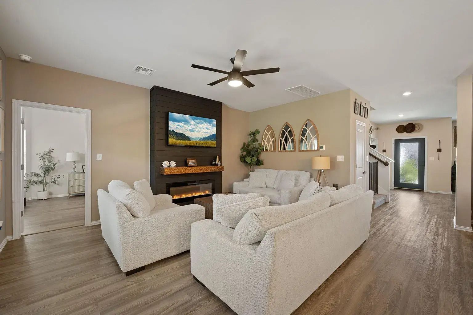 This home offers plenty of room with 4 bedrooms, 2.5 baths, two living areas and two dining spaces. The kitchen is a standout with a large eat in island, freshly painted upper cabinets, new tile backsplash and a built in bench that makes the breakfast nook feel cozy. Both living rooms include beautifully crafted electric fireplaces that add warmth and character. The primary bedroom is on the main floor with a walk in shower, double vanity and walk in closet. Upstairs bedrooms and the second living area provide great separation of space for work, play or guests.